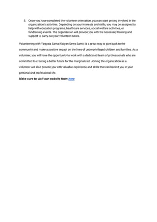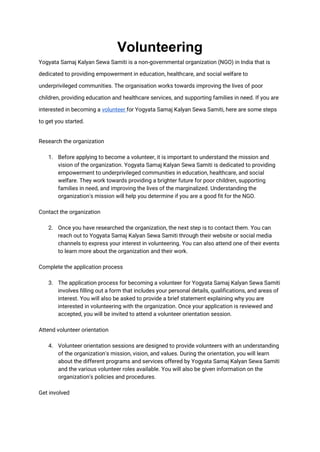 Yogyata Samaj Kalyan Sewa Samiti is a non-governmental organization in India focused on empowering underprivileged communities through education, healthcare, and social welfare. Prospective volunteers should research the organization, contact them to express interest, complete an application, and attend a volunteer orientation before getting involved in various activities. Volunteering offers an opportunity to impact marginalized lives positively while gaining valuable experience.