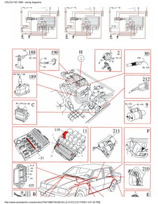 The document contains wiring diagrams for a 1989 Volvo 740 vehicle. It includes diagrams for different engine models including the B200/230 E, B200/230ET, B230FT, B230F, B234F, and B200K. The diagrams cover various ignition and fuel injection systems including CI-fuel injection, Motronic, LH-Jetronic, Regina, EZ 116K, EZ 117K, EZ 118K, Rex i, and Renix. There are 27 pages of wiring diagrams provided.