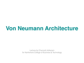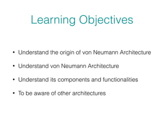 The document discusses von Neumann architecture, which is based on the concept of stored programs in computers. It outlines its three main components: input/output interfaces, the central processing unit (CPU), and memory, while also detailing the architecture's advantages and disadvantages. Additionally, it mentions alternative architectures such as Harvard architecture that separate data and instruction memory.