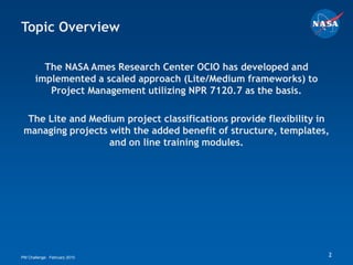 The NASA Ames Research Center has developed a scaled project management framework for IT projects under $500k based on NASA's NPR 7120.7. The framework includes Lite and Medium classifications to provide flexibility and structure for smaller projects. It establishes common project reviews, entrance and success criteria, and decision points for projects below the NPR 7120.7 threshold. The framework is flexible and can be tailored to each individual project's needs.