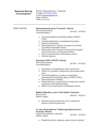 Виктор Александрович Воронков – веб-администратор и программист с опытом работы в различных компаниях, включая "Сколково" и "Има Груп". Он обладает знаниями в области front-end и back-end разработки, а также опытом системного администрирования. Воронков имеет высшее образование в области управления и информатики, а также научные публикации в области разработки программного обеспечения.