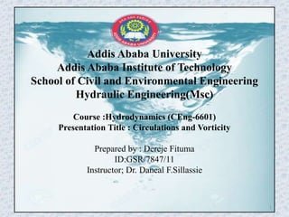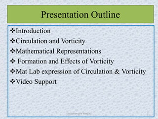 This presentation discusses circulation and vorticity in fluid dynamics. It defines circulation and vorticity, describes their mathematical representations, and how vorticity forms. It examines forced and free vortices, and classifies vortices according to their effects. The presentation also explores how vortices impact hydraulic structures like dams and how to suppress vortices, and includes MATLAB code examples and videos to demonstrate circulation and vorticity concepts.