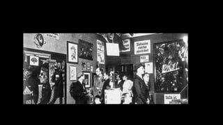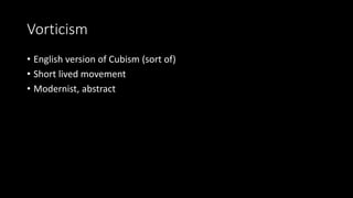 Vorticism was a short-lived early 20th century modernist movement in Britain that was inspired by Cubism. Key figures included David Bomberg and Wyndham Lewis. Vorticism featured abstract, geometric styles. Dada was an anti-war, anti-bourgeois art movement that began in Zurich during World War I. Key figures included Tristan Tzara, Jean Arp, and Marcel Duchamp. Dadaism used techniques like cut-up words, chance operations, and found objects to subvert traditional artistic conventions. Marcel Duchamp pioneered the concept of the "readymade" artwork by selecting mundane mass-produced objects and designating them as art.