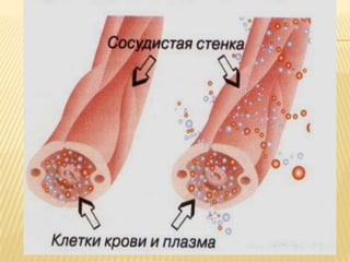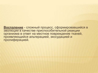 Документ описывает процесс воспаления как сложную адаптационную реакцию организма на повреждение тканей. В нем рассматриваются компоненты воспаления, механизмы и формы, а также клинические признаки и реакции организма на воспаление. Особое внимание уделяется медиаторам воспаления и их влиянию на сосудистые реакции и клеточное размножение.