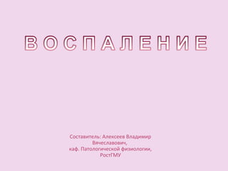 Документ посвящен воспалению как патологическому процессу, описывающему его основные компоненты, механизмы и медиаторы. Рассматриваются экзогенные и эндогенные факторы, классы воспалительных процессов, характерные проявления и свойства экссудатов. Также затрагиваются местные и общие признаки воспаления, включая реакции организма на воспалительные факторы.