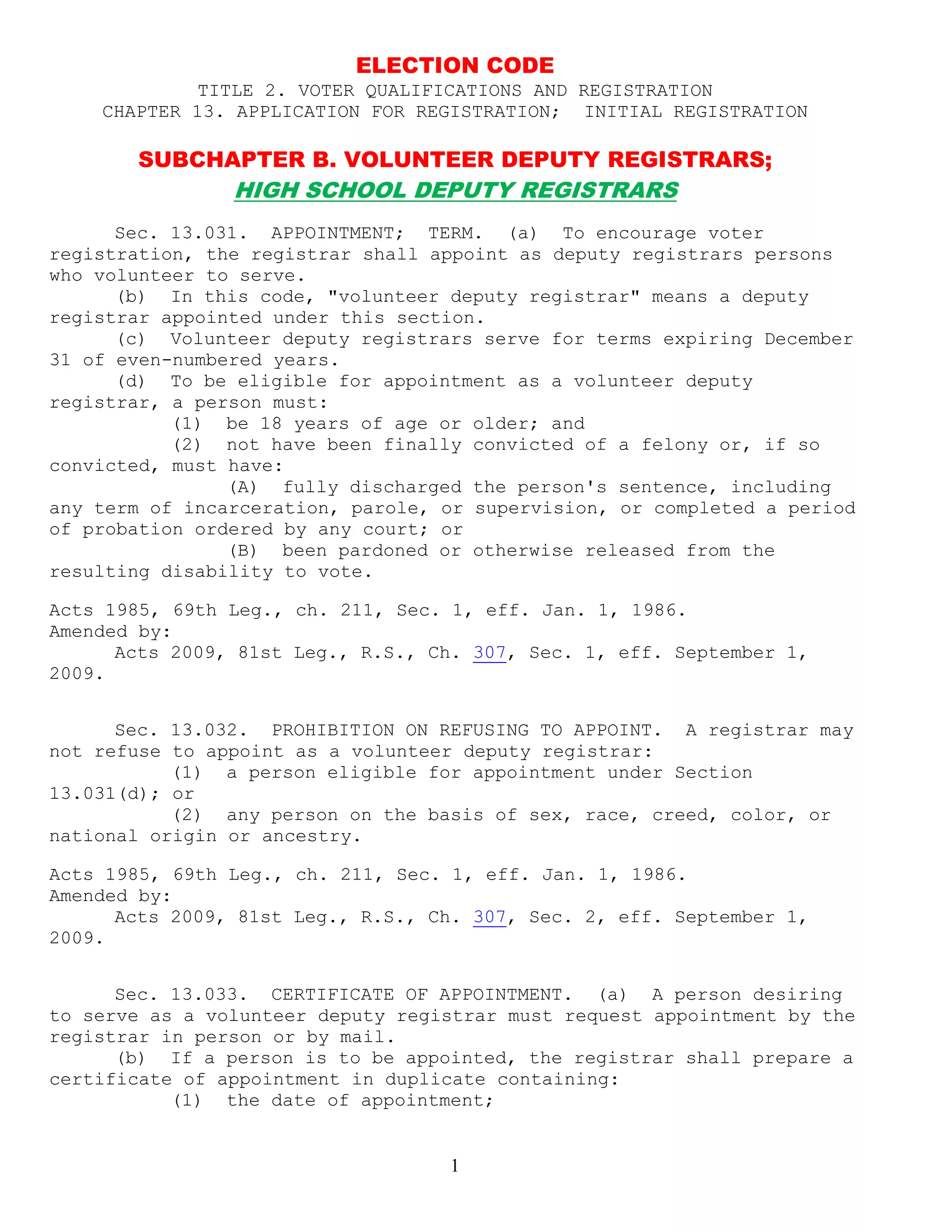 This document outlines Texas laws regarding volunteer deputy voter registrars and high school deputy registrars. It discusses the appointment process for volunteer deputy registrars, including eligibility, terms of service, and prohibited bases for refusal of appointment. It also describes the duties of deputy registrars, such as reviewing applications for completeness and delivering applications to the registrar within certain deadlines. Failure to perform duties, such as timely delivery of applications, is subject to criminal penalties. High school principals are automatically made deputy registrars and must distribute voter registration forms to eligible students twice per school year.
