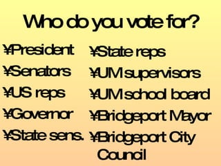 This document summarizes key aspects of voting, lobbying, and government agencies in the United States: 1) It lists various elected positions that citizens can vote for from the President down to local mayors and council members. It also discusses initiatives, referendums, and recalls that allow public voting on issues, laws, and removing officials from office. 2) It provides a brief history of voting rights expansions in the US from only white male property owners in the early 1820s to all races, women, 18-year-olds, and Native Americans at different points over time. 3) It notes that agencies like the FDA and EPA are created by Congress to make specific rules regarding issues like