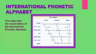 The document provides an overview of vowel letters in the International Phonetic Alphabet, emphasizing their role as syllabic speech sounds produced without stricture in the vocal tract. It discusses the phonetic and phonological definitions of vowels, highlighting their characteristics, types (monophthongs, diphthongs, and triphthongs), and examples in different languages, particularly English. The text also contrasts vowels with consonants and explains their functional importance in syllable formation.