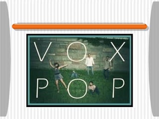 A vox pop is a short audio montage of public opinions on a topic, typically recorded on location with background noise. It represents the views of a small number of people willing to speak and aims to include a range of voices by age, gender, ethnicity and opinion. Questions are kept short to elicit concise responses and avoid complex queries. The best vox pops are fast-paced and feature quirky responses.