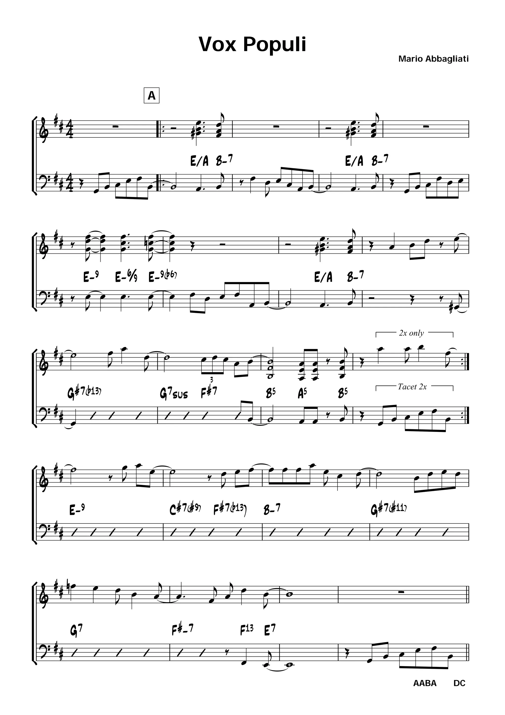 This document contains musical notation for a jazz composition titled "Vox Populi" by Mario Abbagliati. It consists of chord progressions notated using chord symbols over two pages. The composition has the form of AABA with a bridge and uses a minor blues feel with jazz harmonies.