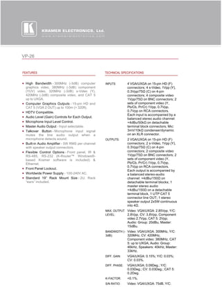 The VP-26 is a 4x2 video and audio matrix switcher that can switch between composite, S-Video, component, VGA, and s-Video video sources, along with their associated stereo audio. It has 14 total inputs, flexible control options, audio level controls, a microphone input, and built-in amplification. The device is designed for presentation and multimedia applications, has HDTV compatibility, and can switch high bandwidth video and audio signals up to long distances.
