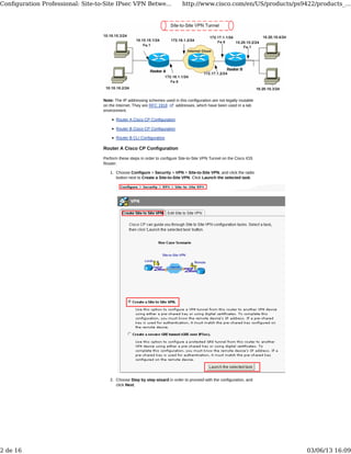 Cisco Configuration Professional allows for the configuration of site-to-site IPsec VPN tunnels between two Cisco IOS routers. The document provides an example configuration using static routes that establishes an IPsec tunnel between Router A and Router B. The configuration is performed using Cisco Configuration Professional on each router and specifies the IKE and IPsec proposals, transform sets, and traffic to be protected between the 10.10.10.0 and 10.20.10.0 networks. Show commands are included to verify the tunnel is successfully established and traffic is being encrypted and decrypted.