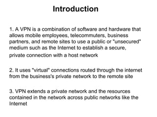 Virtual Private Networks (VPN) allow secure connections over public networks like the Internet. VPNs use encryption to create "virtual private tunnels" between devices. This allows remote users to access resources on a private network as if they were directly connected. There are two main types - remote access VPNs for individual users and site-to-site VPNs to connect multiple office locations. VPNs work by encapsulating data packets within encrypted "tunnels" to securely transmit them between endpoints across public networks while maintaining privacy and security.