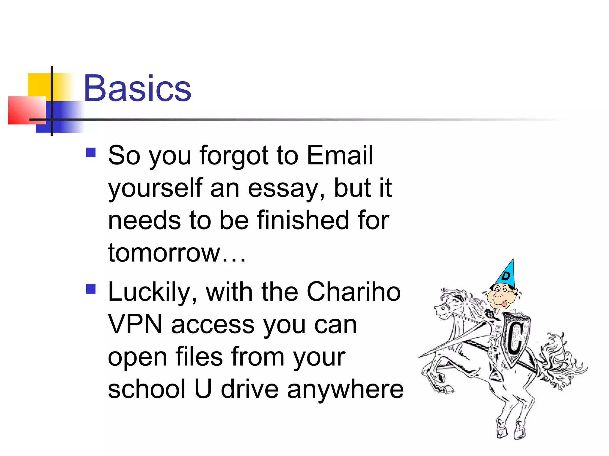 This document provides instructions for using the Chariho VPN remote access to access school files from home. It explains how to log in to the VPN using your school username and password. Once logged in, users can access files saved on their school U drive or public P drive. The instructions describe how to find needed files, open them using the appropriate applications, save changes, and re-upload edited files back to the U drive. The goal is to allow students to access and work on school files from any computer using the VPN connection.