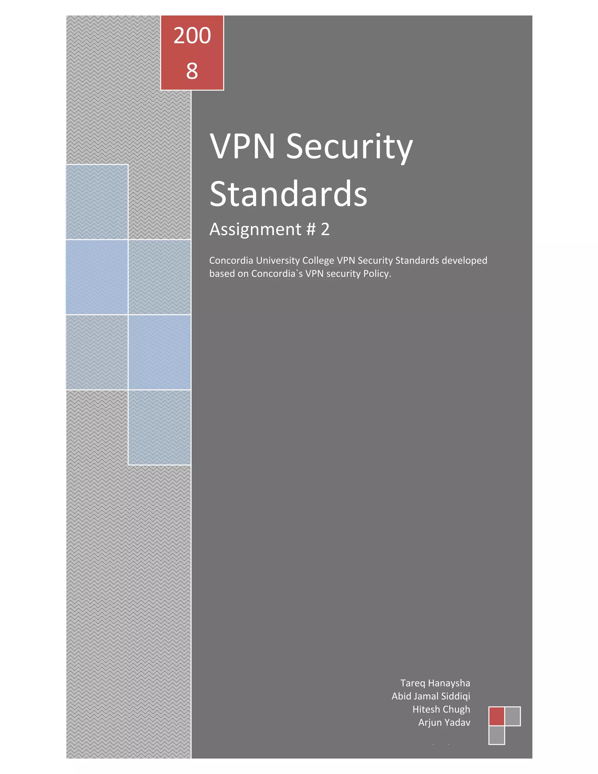 This document is a standard developed by Concordia University College for their VPN security. It begins with definitions of a policy, standard, and guideline. A policy outlines specific requirements, a standard describes system-specific procedures that must be followed, and a guideline provides suggestions for best practices.