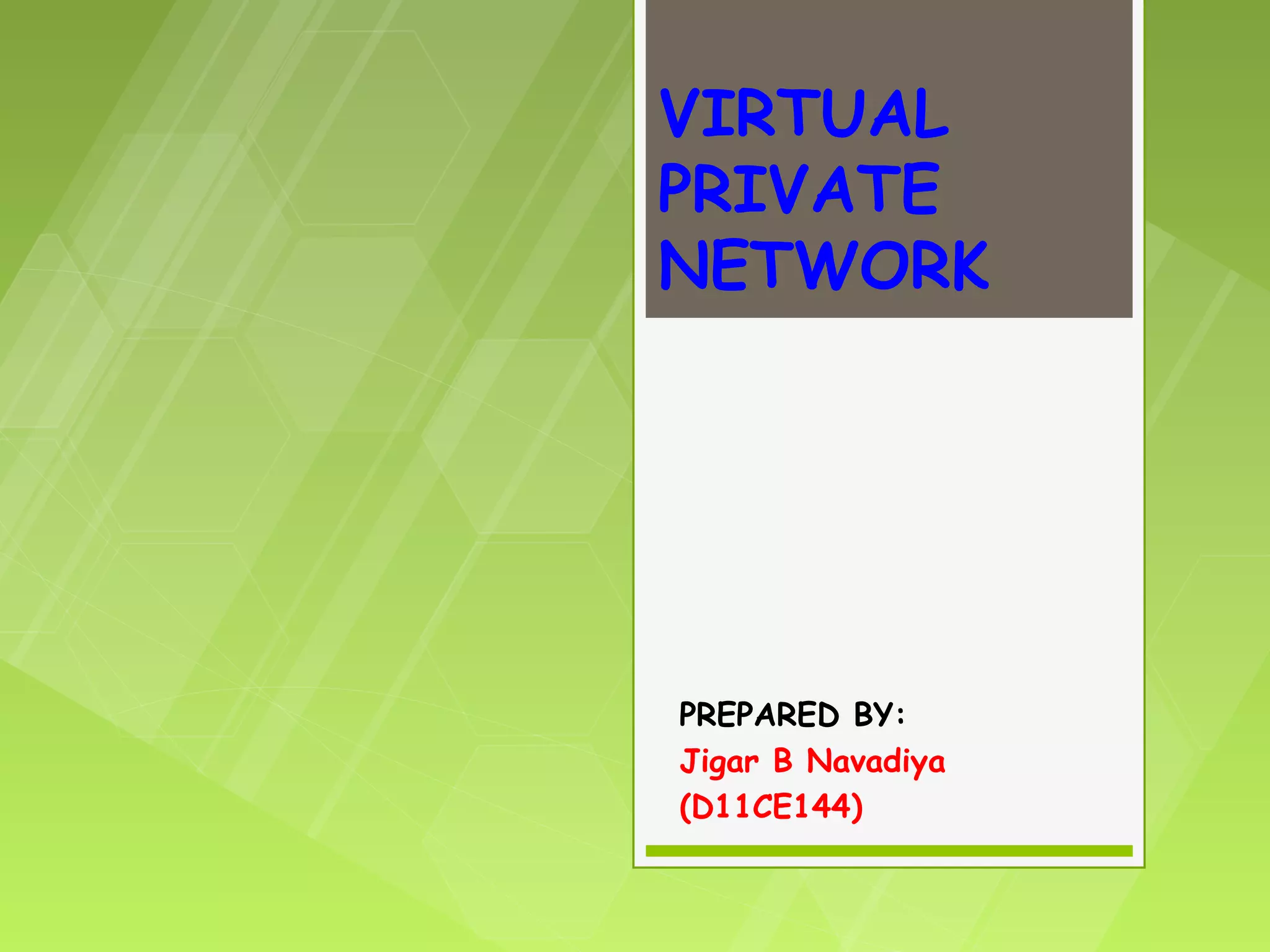 This document discusses virtual private networks (VPNs). It defines a VPN as a network that uses the open infrastructure of the internet to transmit data between corporate sites. It describes the need for VPNs to allow remote employees, growing corporations, and developing business relations to securely access corporate databases. The document outlines the basic working of VPNs through encrypted tunnels between remote users or sites and destination security servers. It also lists different types of VPNs and the protocols and hardware used to implement VPNs.