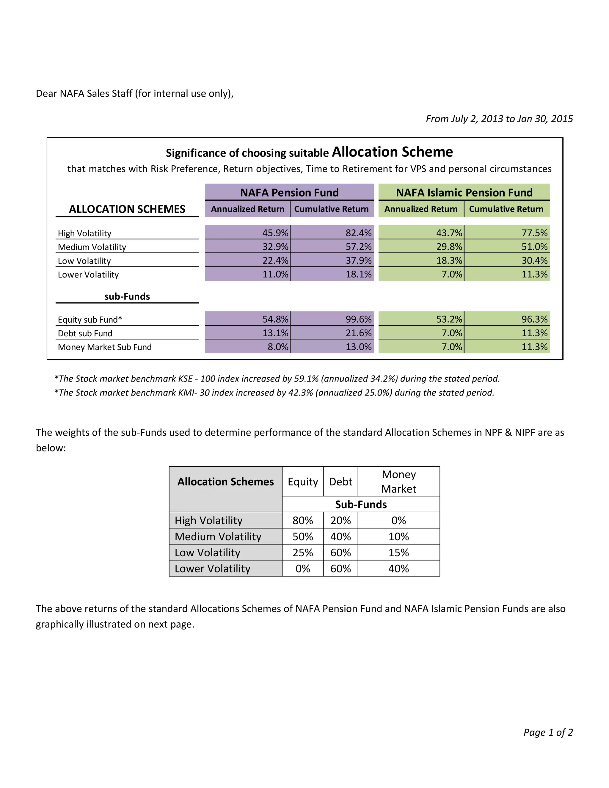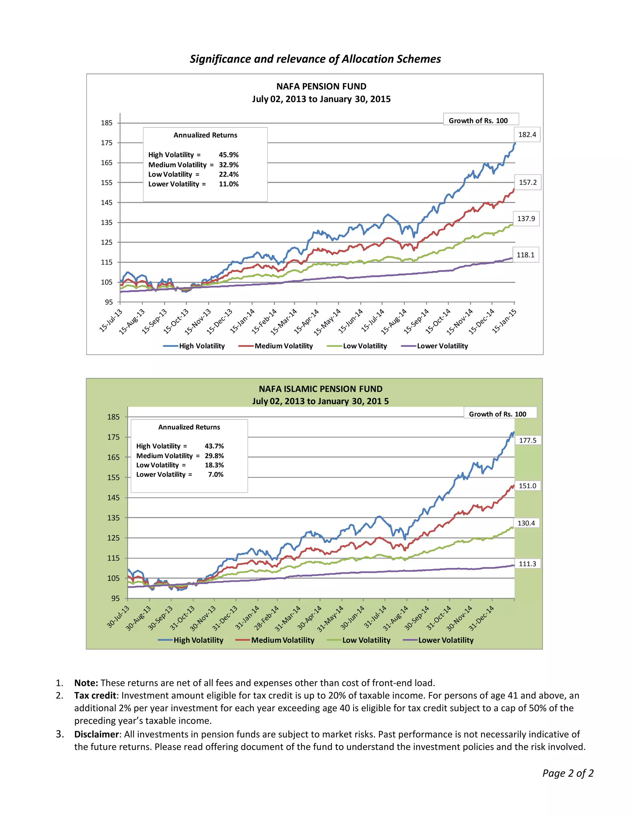 The document discusses the performance of various allocation schemes for the NAFA Pension Fund and NAFA Islamic Pension Fund between July 2, 2013 and January 30, 2015. The high volatility allocation scheme saw the highest annualized returns of 45.9% and 43.7% respectively, while the lower volatility allocation scheme saw the lowest returns of 11% and 7%. Graphs on the second page illustrate the growth of Rs. 100 under each allocation scheme for both funds over this period. The document emphasizes choosing an allocation scheme that matches an individual's risk preference, return objectives, and time to retirement.