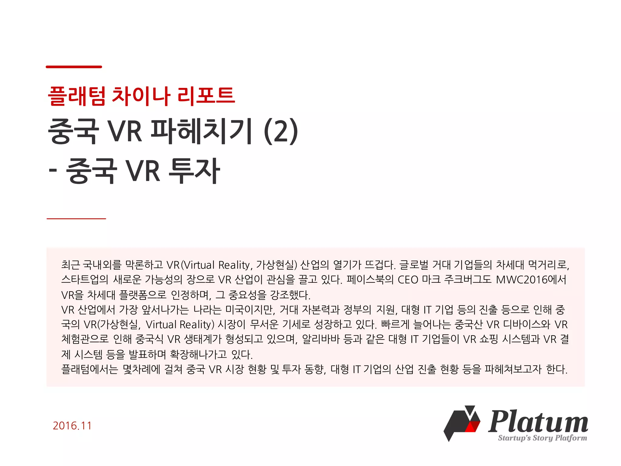플래텀에서는 몇차례에 걸쳐 중국 VR 시장 현황 및 투자 동향, 대형 IT 기업의 산업 진출 현황 등을 파헤쳐보고자 한다.
