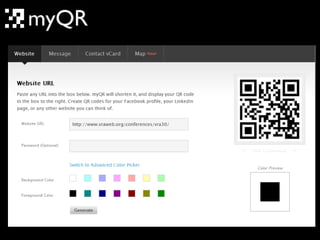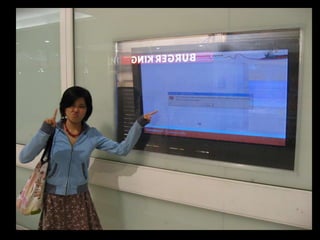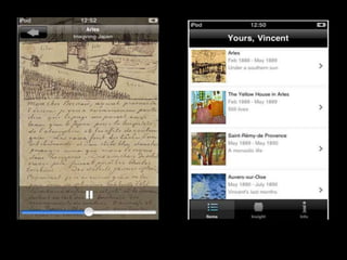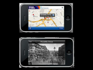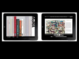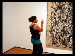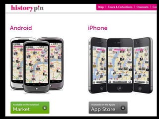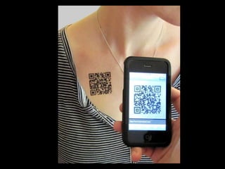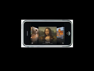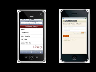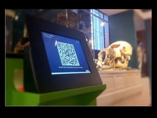 The document discusses various technologies such as smartphones, tablets, and augmented reality, emphasizing themes of instant access and engagement. It highlights collaborative efforts between IT, library partners, and museums to enhance user experience through digital signage and QR codes. Additionally, it includes a variety of image credits related to the content presented.