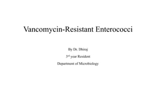 Vancomycin-resistant enterococci (VRE) are a significant cause of hospital-acquired infections. Enterococcus faecium and Enterococcus faecalis are the most common clinical species. VRE have acquired resistance to vancomycin through the alteration of peptidoglycan precursors in cell wall synthesis. The vanA and vanB genotypes are most prevalent and confer high-level resistance. Treatment involves combination therapy with cell wall active agents and aminoglycosides. Early detection of VRE enables timely infection control measures to limit spread.