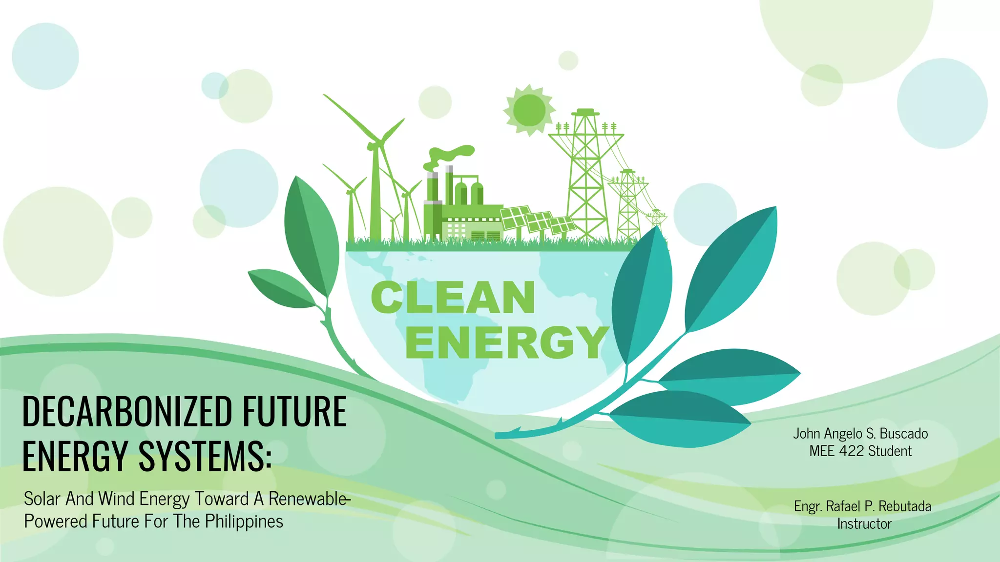 The document discusses the potential for solar and wind energy to power the future of the Philippines. It notes that a single wind turbine can power 600 homes and that solar power is the most abundant energy source on Earth. It outlines the Philippines' goals of reaching 3 GW of solar capacity by 2022 and challenges such as high upfront costs. However, incentives like tax breaks and priority grid access could help overcome challenges to the renewable transition.