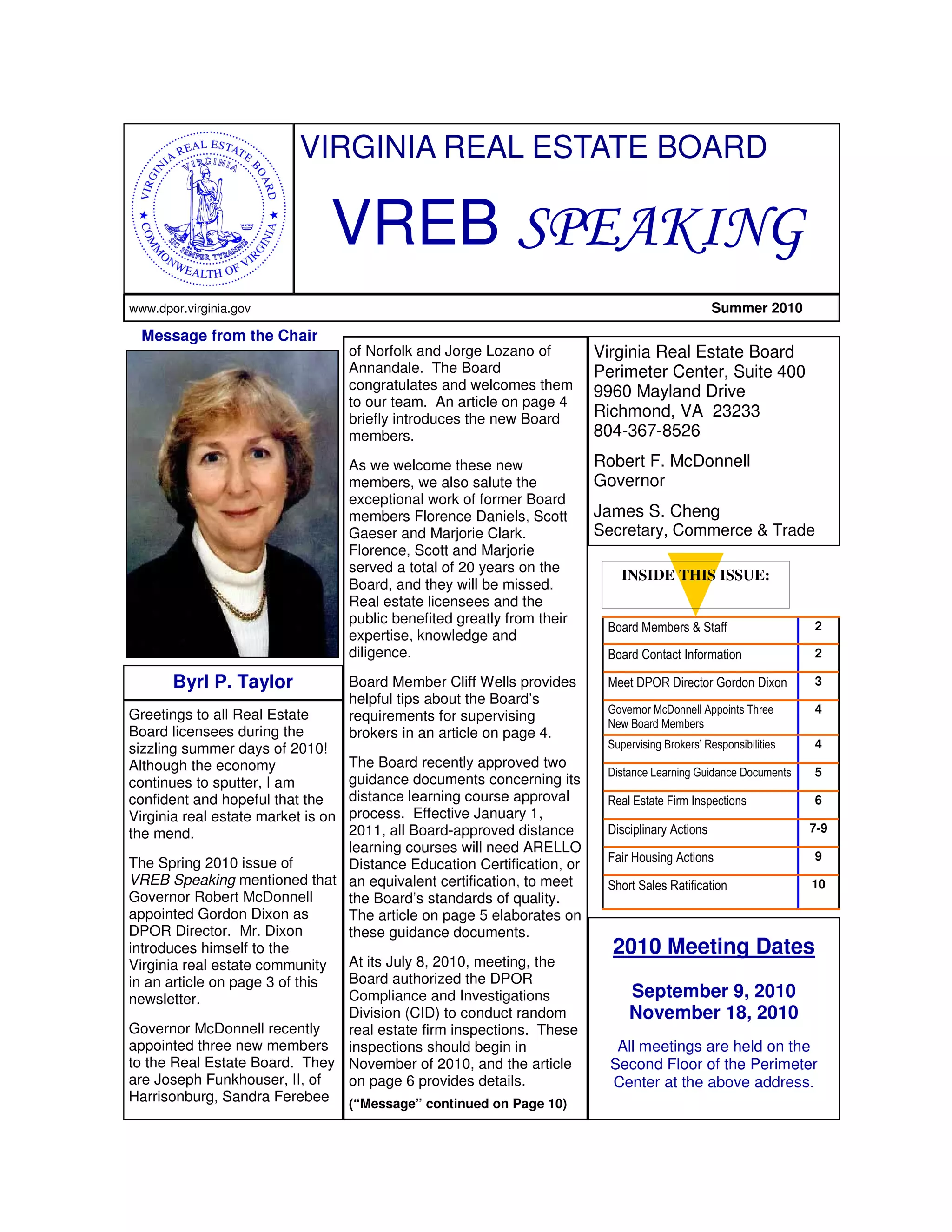 The Virginia Real Estate Board approved random inspections of real estate firms beginning in November 2010. The inspections will be conducted by the Department of Professional and Occupational Regulation's Compliance and Investigations Division. The inspections are intended to ensure real estate firms are complying with Board regulations regarding record keeping and supervision. Firms selected for inspection will be notified by phone or in person to schedule the inspection.