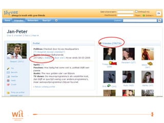 Om mensen tebereiken kunnen we niet meer zonder het sociale web Sociale web Hyves: > 6 miljoen leden Facebook: > 2 miljoen LinkedIn > 1 miljoen Twitteren > 700.000 Best bekeken You tube film in 2009: Susan Boyle 120 miljoen 74% van de Nederlandse internetters heeft een profiel aangemaakt op één van de sociale netwerken Mainstream media Telegraaf 680.000 VK 275.000 NRC 201.000 AD 440.000 Beste bekeken TV progr. in 2009: Boer zoek vrouw 4,5 miljoen Kijktijd TV blijft gelijk: 130 m/pd