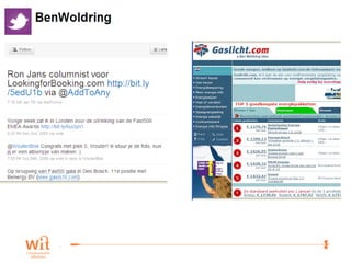 Een twitteraccount innog geen strategie? 11 tips Wie zijn er in uw branche actief in sociale media en waar hebben ze het over 2. Wie en waar zitten uw ‘Connectors’, ‘Mavens’ en ‘salesmen’ Luister voordat u deelneemt Experimenteer Transparant en eerlijk Deel kennis, informatie, foto’s en video’s op die plekken waar het gebeurt Persoonlijk (en gedraag je ook als een persoon) Draag bij op een betekenisvolle manier Weet hoe je vooraf met kritiek omgaat Reageer snel Reputatie is belangrijker imago