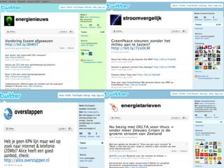 Essent Eneco Strenght = de kans dat er over uw merk in de sociale media wordt gesproken Sentiment = ratio positief:negatief Passion = de waarschijnlijkheid dat men vaker over uw merk praat Reach = aantal unieke auteurs x het aantal keer dat ze uw merk noemen Via socialmention.com Nuon