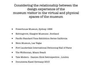 Virginia Rigney explores the interplay between virtual and physical museum experiences, referencing various renowned institutions and exhibitions. The document highlights specific art pieces, initiatives, and a fellowship trip supported by Museum and Gallery Services Queensland. It emphasizes the significance of design in enhancing visitor engagement in both spaces.