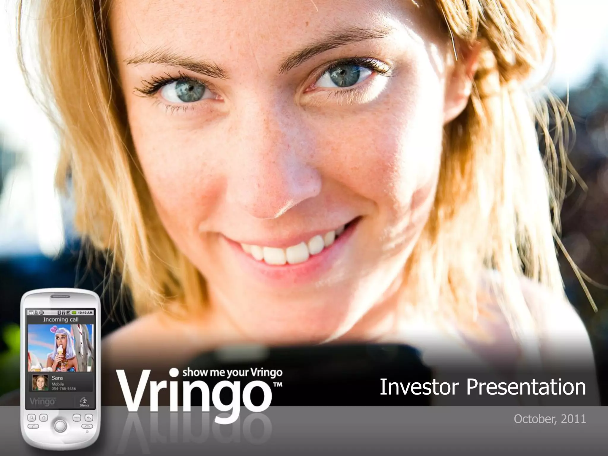 The document provides an investor presentation for Vringo, Inc. It discusses Vringo's mobile social and video platforms, including video ringtones, video remix, facetones, and fan loyalty. It highlights Vringo's partnerships with carriers in multiple countries, growth in subscribers, and future strategic growth drivers through expansion of products and acquisitions. The presentation aims to position Vringo for capitalizing on growing demand in the mobile social and video application industry.