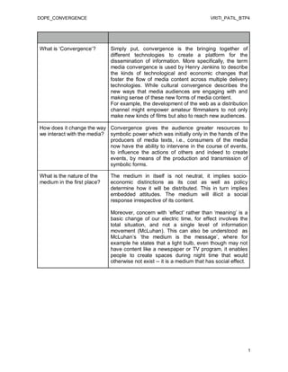 Convergence brings together different technologies to disseminate information. It gives audiences greater ability to intervene and influence events by producing and sharing symbolic content. The medium itself comes with socio-economic biases based on costs and policies. McLuhan argued that the medium itself carries a message beyond just content. While technology can determine its uses, society also shapes technology deployment based on social groups and power dynamics. Traditional news media are expanding to new platforms but citizen journalism is still limited by established players. 3G enables easier streaming and multi-tasking but remains niche in India. Future news focuses on community empowerment through civic and participatory media projects giving people ownership of local content. Convergence examines changing information environments and heightened expectations of participation.