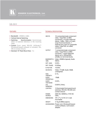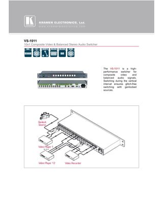 The VS-1011 is a 1U rack mountable 10x1 composite video and balanced stereo audio switcher that allows glitch-free switching between 10 video and 10 audio sources. It features vertical interval switching synchronization, front panel and RS-232/RS-485 control, and a bandwidth of 250MHz for video and 55kHz for audio. The switcher provides high quality switching with low differential gain, phase, nonlinearity, crosstalk and distortion.