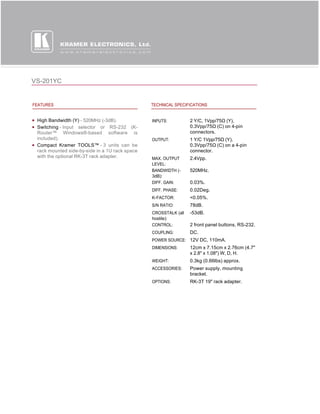 The VS-201YC is a high quality 2x1 s-video switcher that switches between two s-video input signals and sends the selected signal to a single output. It has high bandwidth of 520MHz, switching via front panel buttons or RS-232 control, and can be rack mounted with an optional adapter.
