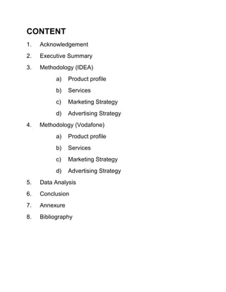 The document provides a comparative study of Idea and Vodafone cellular companies in India. It discusses their product profiles, services, marketing strategies and advertising approaches. Idea offers services like EDGE technology, value added services, and targets different customer segments through tariff plans. Vodafone is a global company operating in India through subsidiaries, offering various communication services to consumers and businesses. Both companies focus on network quality and value added features to attract and retain customers in the competitive Indian market.