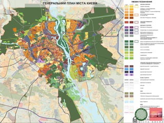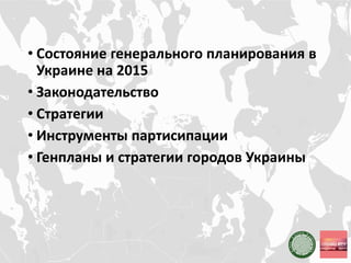 Документ анализирует состояние генерального планирования в Украине на 2015 год, выявляя проблемы, такие как отсутствие генпланов в некоторых городах и несоответствие их актуальным данным. Он также подчеркивает необходимость улучшения инструментов партисипации для вовлечения сообщества в процесс градостроительного планирования. Наконец, документ описывает различные уровни генерального планирования и существующие законодательные и организационные барьеры.