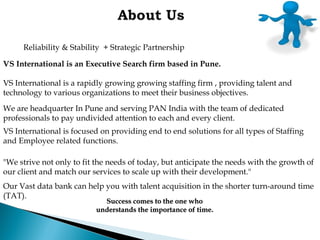 VS International is a staffing firm based in Pune, India that provides talent and technology to organizations to help them meet their business objectives. It focuses on end-to-end staffing and recruitment solutions, from executive search to middle and entry-level hiring. The company maintains a vast database to help clients find talent quickly and has dedicated professionals to ensure attention to each client's needs. VS International's vision is to be a leading staffing provider through best practices and exceeding client expectations.