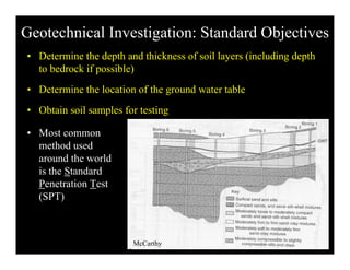 This document summarizes standard penetration testing (SPT) and shear wave velocity profiling, which are important geotechnical investigation techniques for seismic design. SPT involves driving a split spoon sampler into the ground using a hammer and measuring penetration resistance. Shear wave velocity profiling uses borehole, suspension, and surface wave methods to directly measure in-situ shear wave velocities, which are used to classify seismic soil sites according to building codes. Proper site characterization that includes SPT and shear wave velocity data is essential for evaluating soil properties and predicting earthquake ground motions at a site.