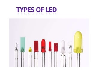 LEDs emit light when electricity is passed through a semiconductor chip. The color of light emitted depends on the material used in the chip. LEDs are more energy efficient than incandescent bulbs and last much longer. They have many applications including indicator lights, automotive lighting, signage, and general illumination.