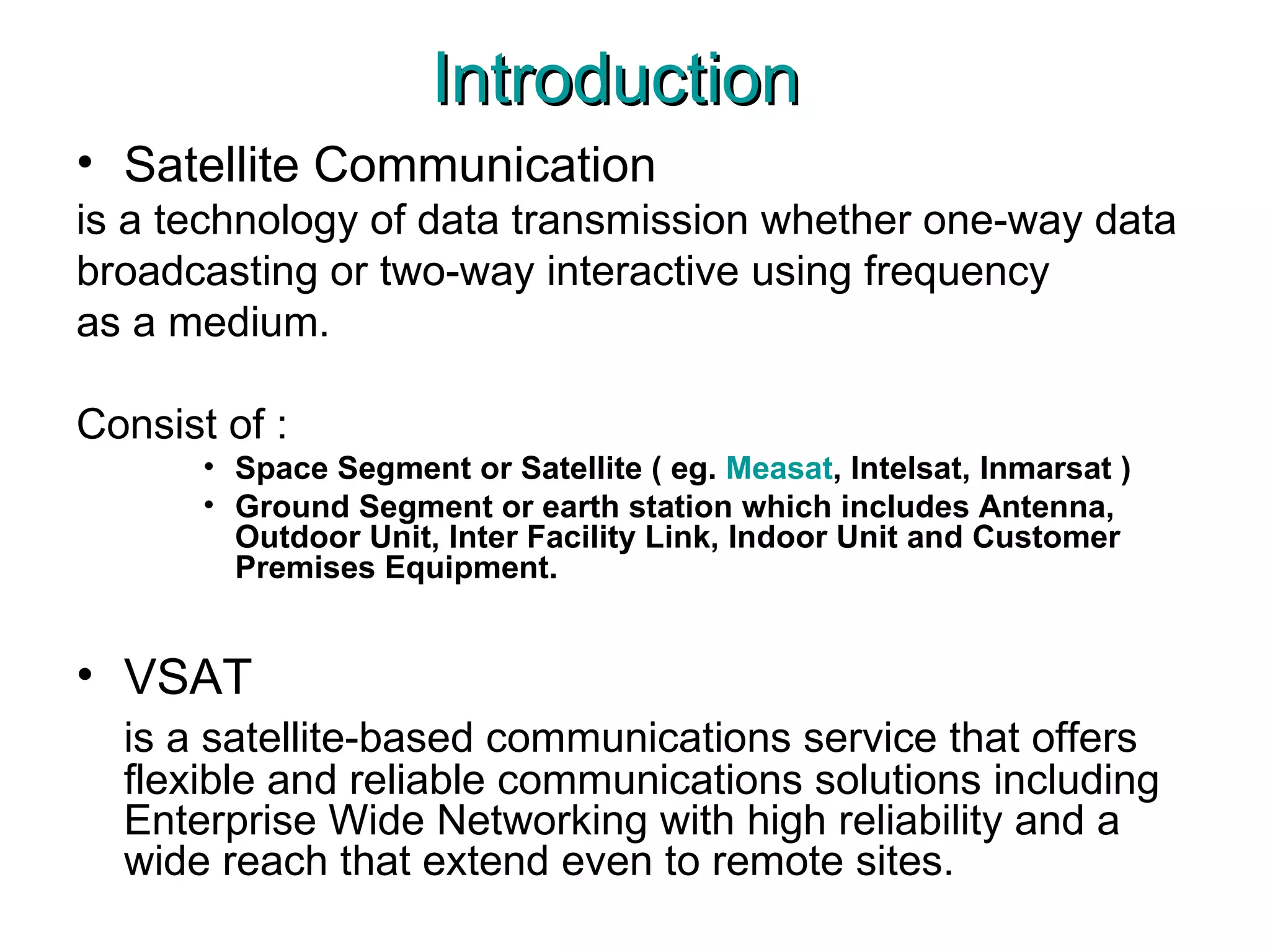 VSAT (Very Small Aperture Terminal) is a satellite-based communication system that provides flexible and reliable connectivity solutions. It uses satellites to provide point-to-multipoint and point-to-point communication between a central hub station and multiple remote sites. VSAT networks offer benefits like reliability, flexibility, network management capabilities, and cost savings compared to terrestrial leased lines. Common VSAT access schemes discussed include TDMA, FDMA, DAMA, and CDMA.