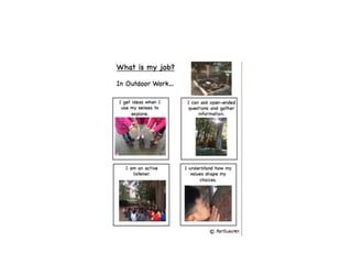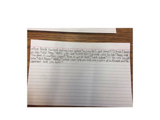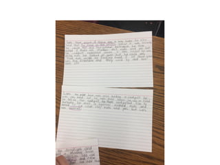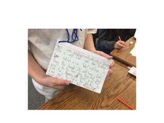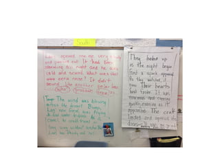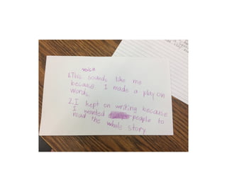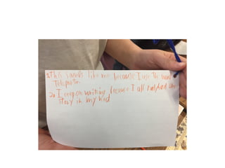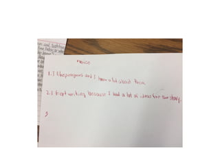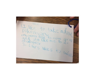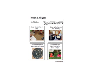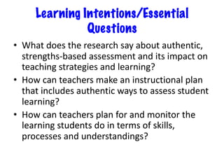 This document outlines themes and strategies from a professional development session on meaningful instruction, assessment, and communication with parents. Key topics discussed include the power of feedback, making learning visible through student voice and agency, teaching with "big ideas", and ongoing communication with families. Specific assessment strategies are presented, such as using formative feedback to improve student performance, developing student self-assessment skills, and creating digital portfolios to showcase the learning process. The document encourages teachers to reflect on how to apply these ideas to increase student ownership of learning.