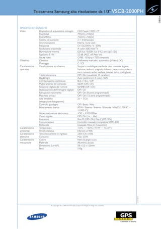 La telecamera Samsung alta risoluzione VSCB-2000PH offre un sensore CCD S-HAD da 1/3'' e una risoluzione di 600 linee TV, con caratteristiche avanzate come la riduzione digitale del rumore e la stabilizzazione dell'immagine. È dotata di 12 zone di mascheramento privacy, rilevazione del movimento e supporto per una varietà di lingue nei menu OSD. Le specifiche indicano un'illuminazione minima di 0,05 lux, un rapporto segnale/rumore di 52 dB e funziona con alimentazione a 230V.