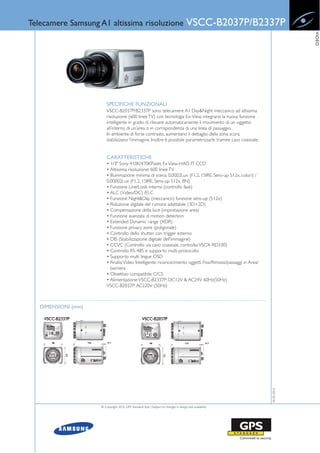 Le telecamere Samsung A1 (modelli VSCC-B2037P/B2337P) offrono alta risoluzione di 600 linee TV e tecnologia Ex-View, con funzionalità di rilevamento del movimento e visione notturna meccanica. Presentano una minima illuminazione di 0,0002 lux e una serie di controlli intelligenti, inclusa l'analisi video avanzata. Le dimensioni variano tra i modelli, e sono progettate per un'ampia gamma di condizioni ambientali.