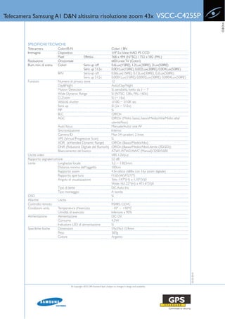 La telecamera Samsung A1 D&N VSCC-C4255P è un dispositivo ad alta risoluzione con zoom ottico 43x e funzionalità avanzate come la funzione Day&Night e la riduzione digitale del rumore. Supporta 12 zone di privacy, ha una sensibilità luminosa minima di 0.001lux in modalità colore, e offre un ampio range dinamico. Le specifiche includono controllo remoto RS-485 e gestione tramite menu OSD multilingue.