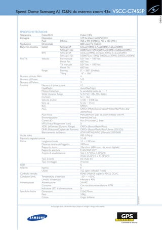 La speed dome Samsung A1 D&N da esterno VSCC-C7455P è una telecamera con zoom ottico 43x e risoluzione di 600 linee TV, dotata di diverse funzionalità avanzate come il day&night, analisi video intelligente e 12 zone di privacy. Può funzionare in condizioni di scarsa illuminazione grazie a una sensibilità minima di 0.007 lux in colori e 0.0007 lux in bianco e nero. Caratteristiche aggiuntive includono stabilizzazione digitale dell'immagine, controllo remoto RS-485 e una costruzione resistente a temperature estreme.