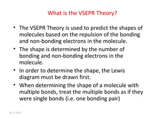 The VSEPR (Valence Shell Electron Pair Repulsion) theory predicts molecular geometry based on electron pair repulsion. The shape is determined by drawing a Lewis diagram and counting bonding and non-bonding electron pairs. Common molecular shapes include tetrahedral for 4 electron pairs, trigonal pyramidal for 3 bonds and 1 lone pair, bent for 2 bonds and 2 lone pairs, and trigonal planar for 3 bonds. Angles vary based on number of lone pairs. Examples of molecular shapes are given for molecules like CH4, NH3, H2O, PF5 and SF6.