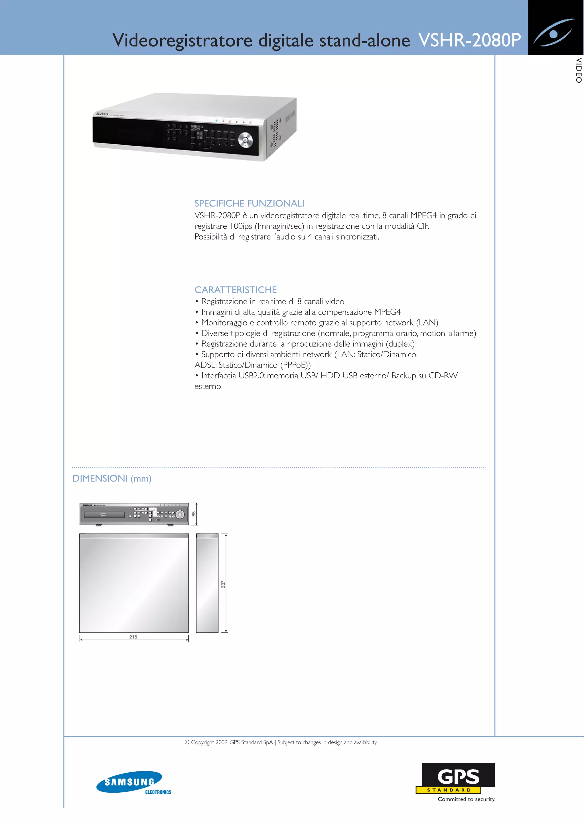 Il VSHR-2080P è un videoregistratore digitale stand-alone che supporta la registrazione in tempo reale di 8 canali video MPEG4 con una qualità delle immagini elevata, offrendo diverse modalità di registrazione e monitoraggio remoto. È dotato di funzionalità audio e supporta connessioni di rete multiple, oltre a un'interfaccia USB per backup e archiviazione. Il sistema ha una memoria interna di base di 250GB, espandibile fino a 1TB, e varie opzioni di ricerca e riproduzione.