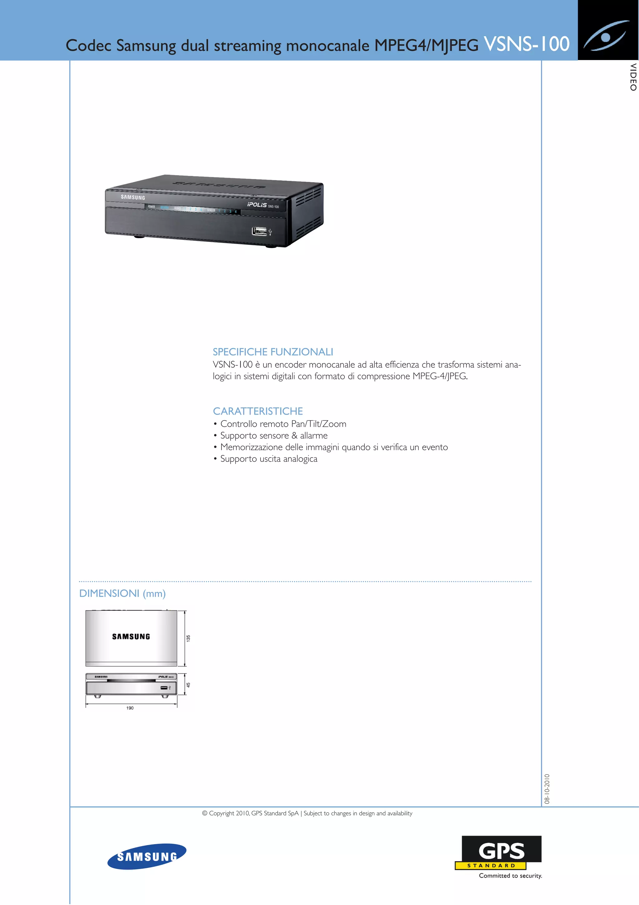 Il VSNS-100 è un encoder monocanale che converte segnali analogici in formato digitale utilizzando compressione MPEG-4/JPEG. Tra le sue caratteristiche figurano il controllo remoto, la rilevazione del movimento, e una varietà di interfacce di rete. Il dispositivo è progettato per operare in diverse condizioni ambientali e supporta molteplici protocolli di comunicazione.