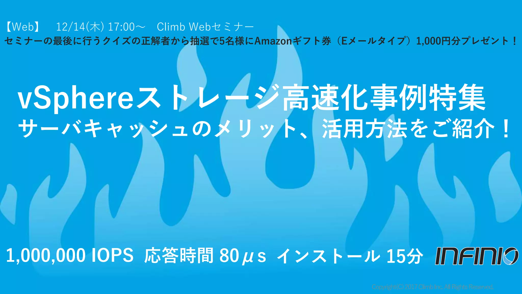 このような事例、VMware環境ストレージ(VSAN, VVOL, SAN, NAS, DAS, ハイパーコンバージドインフラ)へ簡単に爆速を提供するInfinioにご興味のあるかたは是非ご視聴ください。
