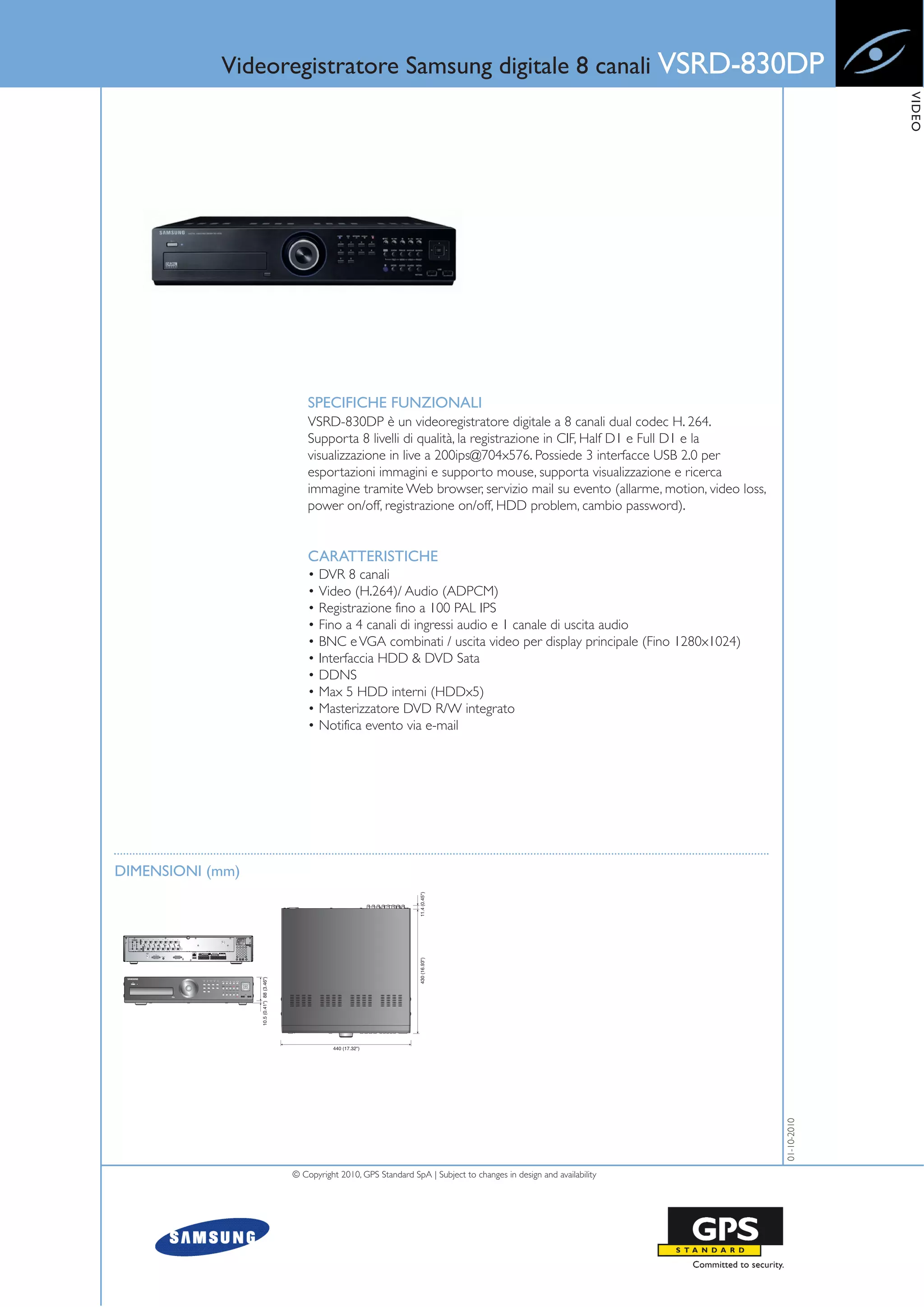 Il videoregistratore digitale Samsung VSrd-830DP a 8 canali utilizza il codec H.264 e supporta diverse modalità di registrazione e qualità video. È dotato di interfacce USB, invio di notifiche via e-mail e capacità di visualizzazione multi-schermo. Questo dispositivo è progettato per gestire ingressi audio, video, e offre varie opzioni di sicurezza e monitora attraverso un'interfaccia web.